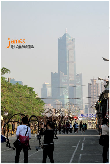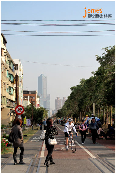 舊鐵道改為人行腳踏車道,更添了幾許悠閒,遠方的85大樓為高雄地標.