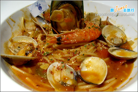 紅茄海鮮義大利麵,剛開始吃會覺得蕃茄醬太甜,