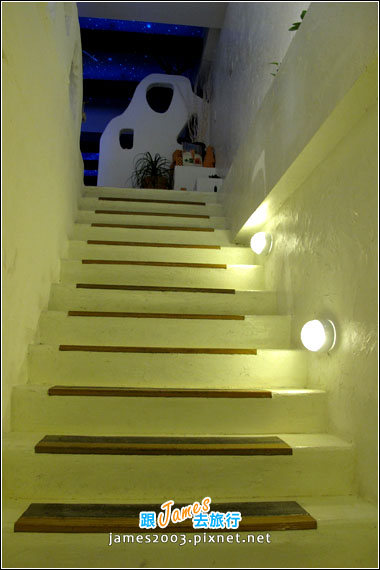 這是通往2樓的樓梯,順著白色的階梯,可以看到遠處的星空?!