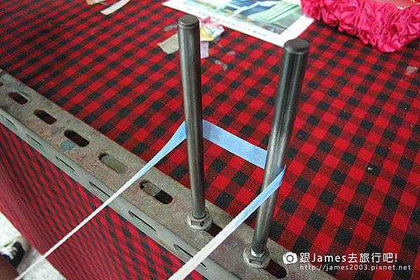 緞帶染色之後,就可以利用旁邊兩根柱子的架子上~編織蝴蝶結。