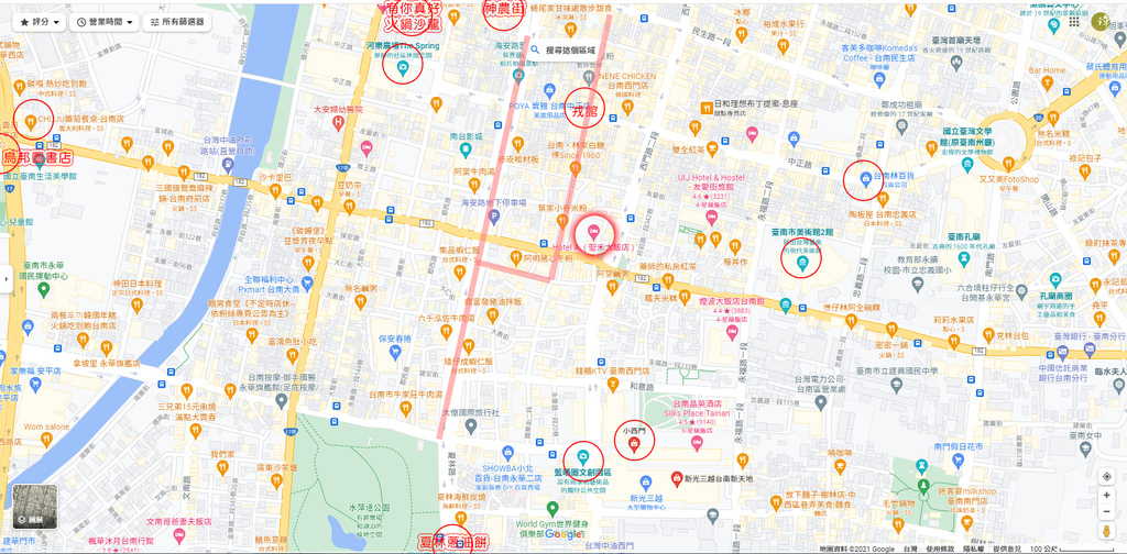 (中間紅線是主要逛街區,紅圈圈是規劃景點)