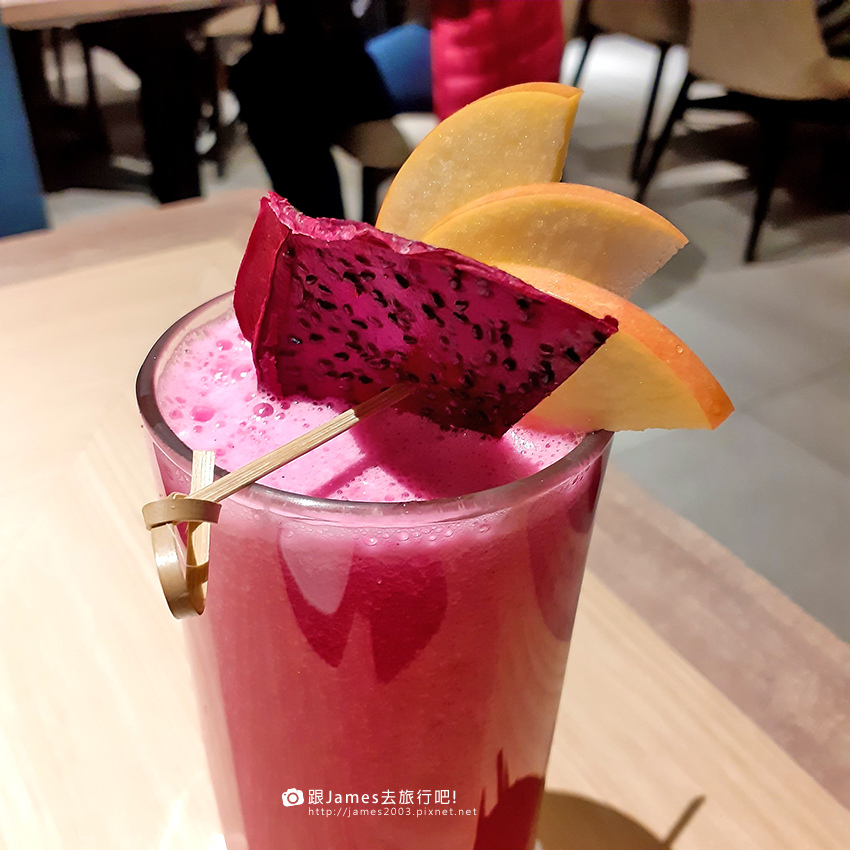 高纖抗氧果汁 光聽名字就覺得非喝不可,果汁內含有火龍果、鳳梨、蘋果、柳橙,覺得美味又健康。