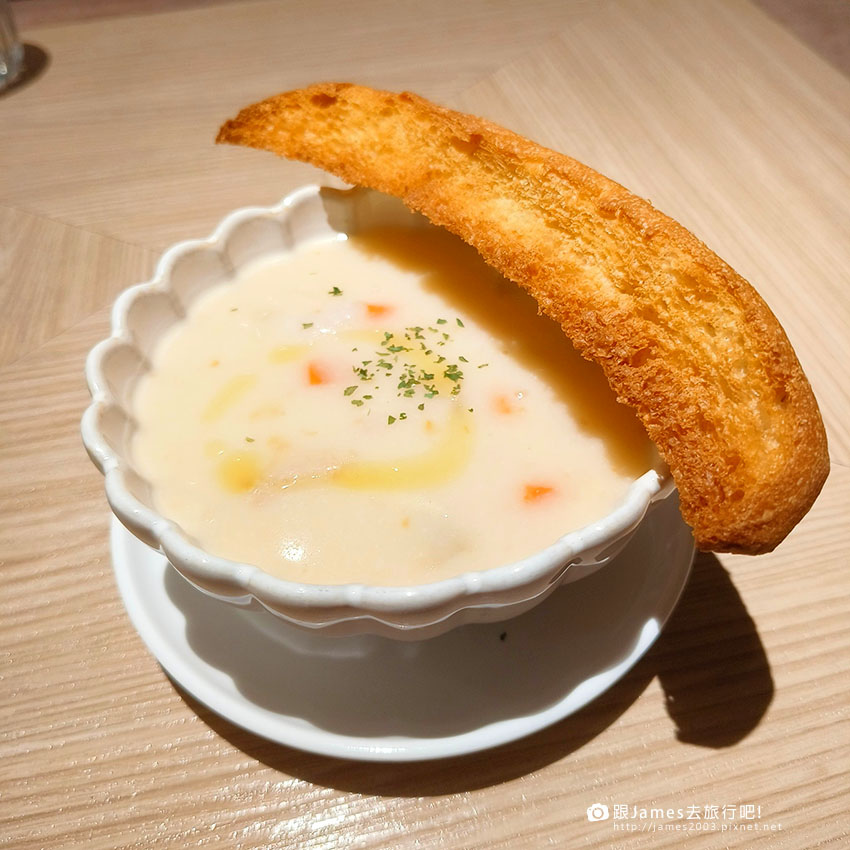 接下來是餐點加NT$180元的套餐~主廚濃湯(海鮮巧達濃湯),搭配麵包或直接喝都有十足幸福感阿。