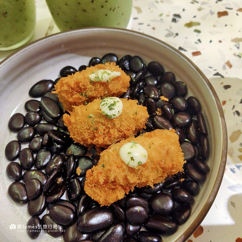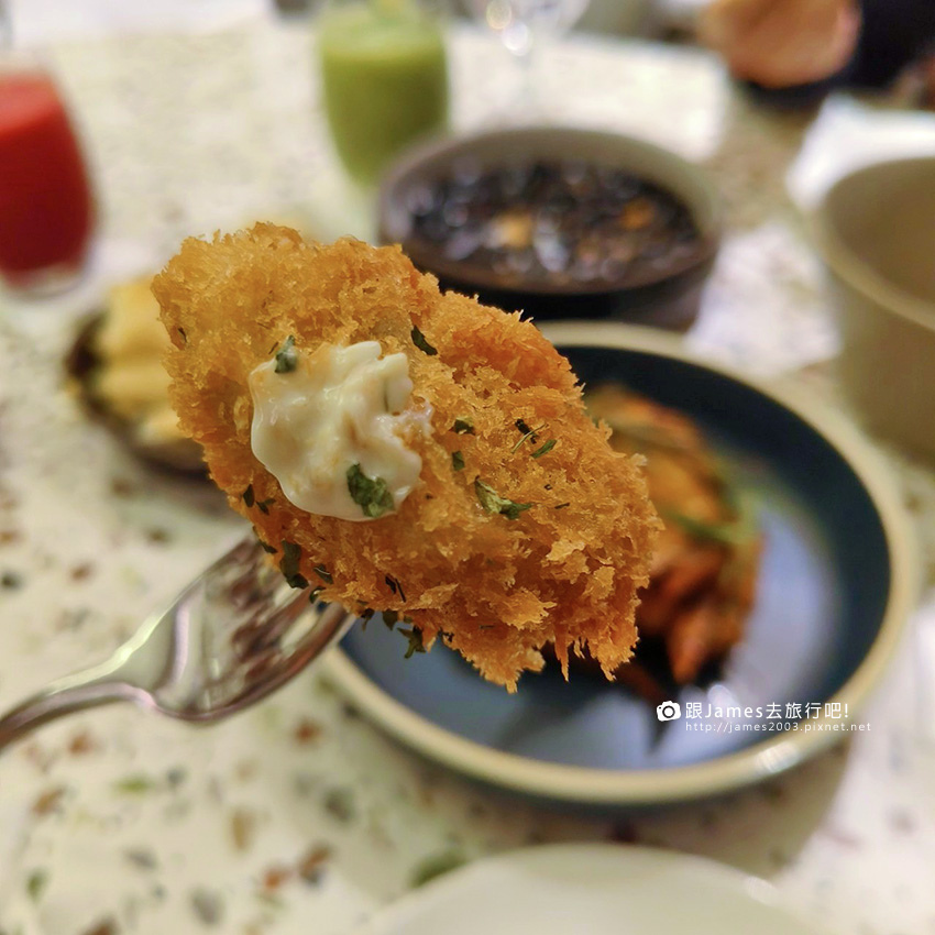 ▲ 開胃菜~日本海炸牡蠣,下面的保溫石材超像巧克力豆,還好服務人員有提醒,哈哈。
