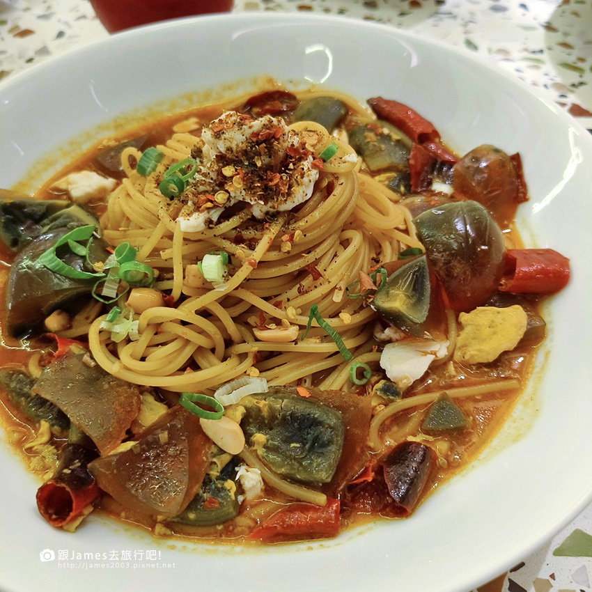▲ 小美女壽星很愛嘗試創意料理,這次嘗試的是皮蛋義大利麵,我有偷吃一口還真不錯吃耶。