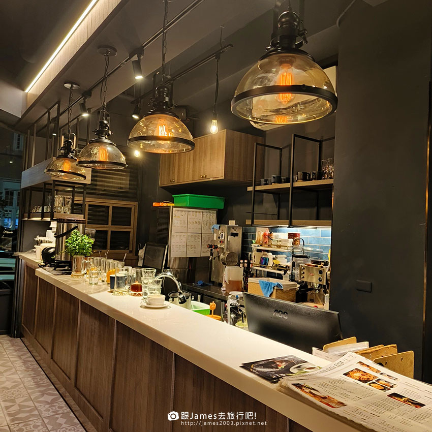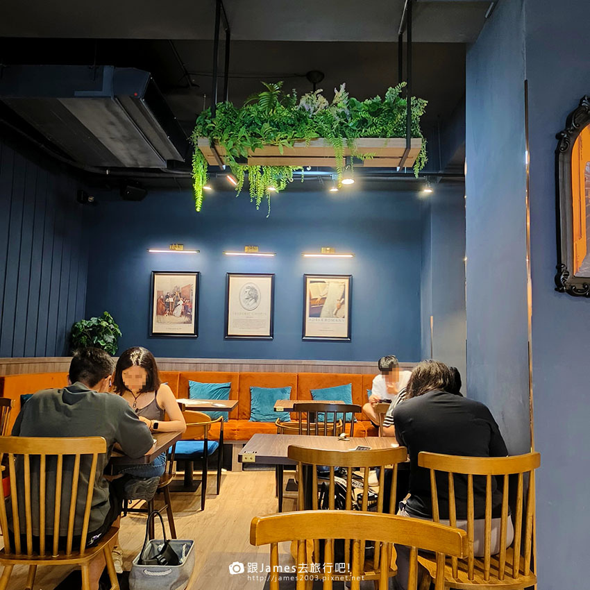 內部裝潢別緻,暗色牆面搭配木質地板元素,營造出悠閒舒適的用餐氛圍。
