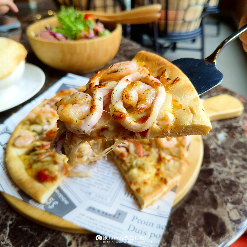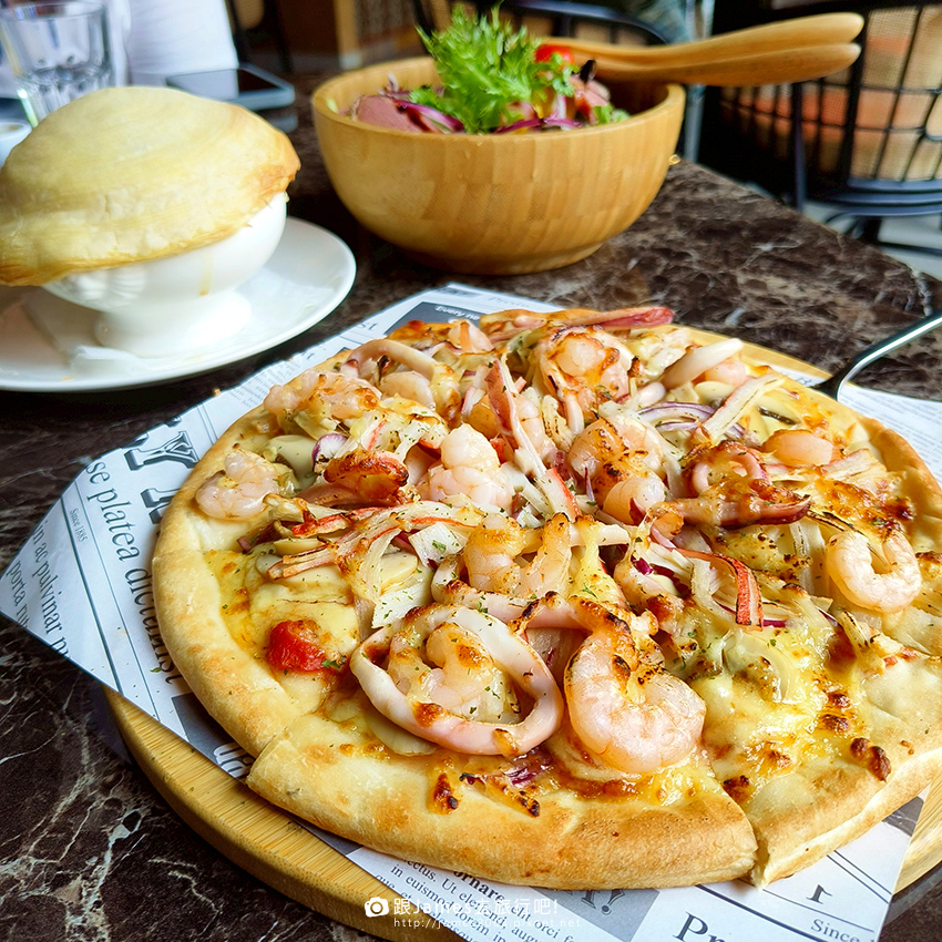 ▲海鮮總匯披薩~薄脆餅皮上鋪滿滿蝦仁、花枝,海味十足!每片都是「料比餅多」的豪爽版本。