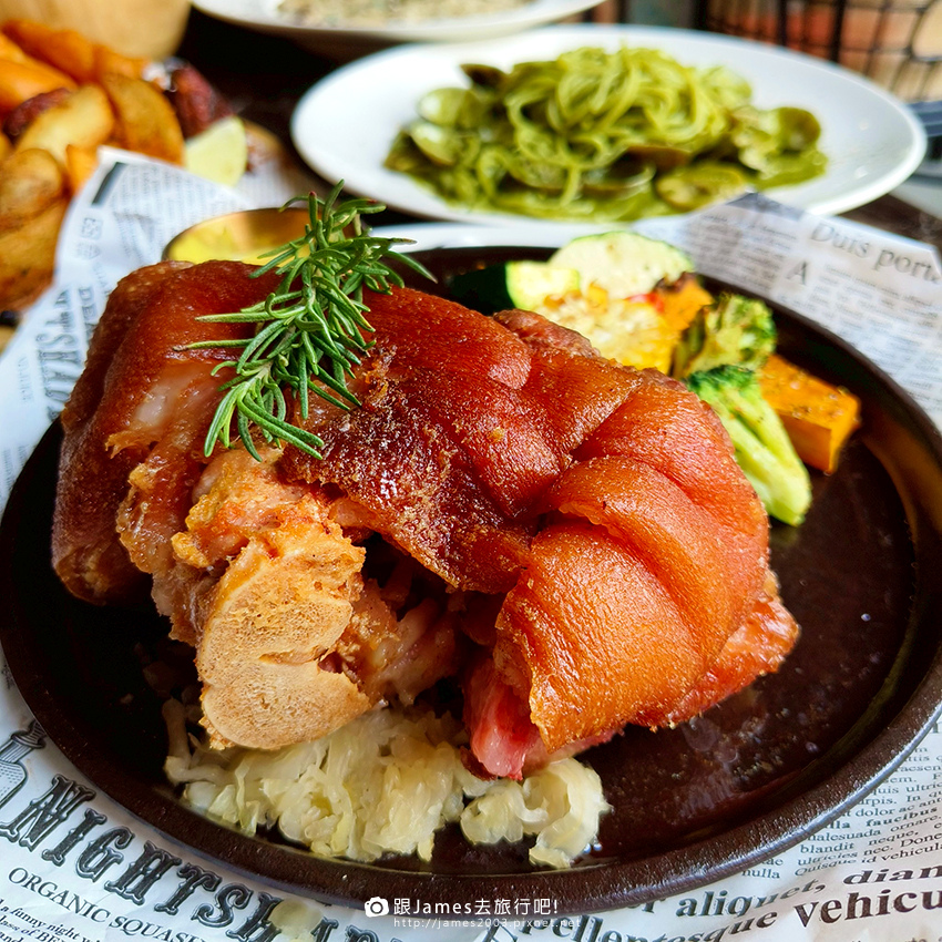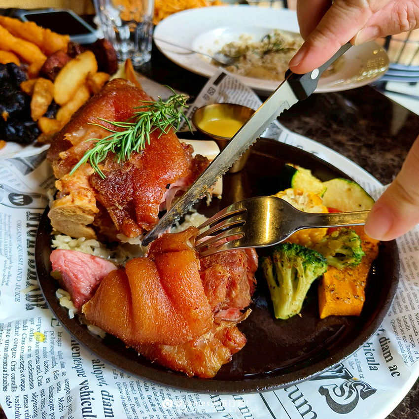 ▲▼日耳曼德國豬腳~德國豬腳外皮烤到金黃酥脆,裡頭肉質Q彈多汁。